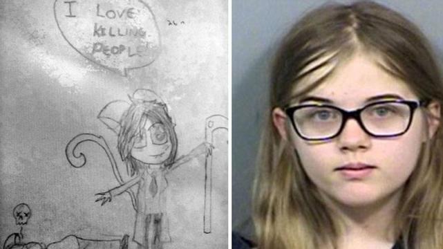 Dibujos en los que aparecían visiones aterradoras de seres que matan a otros o que empuñan armas punzantes. En uno de ellos se lee: “Amo matar personas”, mientras en la parte inferior del dibujo hay una figura caída que gotea sangre, con una calavera sobre la cabeza.