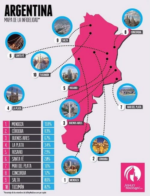 Como cada año, la red social para infieles AshleyMadison.com, realizó un sondeo entre sus usuarios para graficar el porcentaje de miembros per capita y así determinar el mapa de la infidelidad en Argentina. En 2014 los porteños se habían quedado con el primer lugar. Pero este año los mendocinos y los cordobeses dieron la sorpresa.